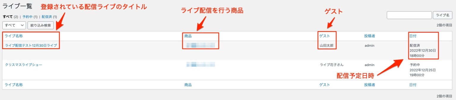 運営管理画面から【ライブコマース】>【ライブ一覧】をクリックすると登録されているライブコマースの一覧ページが開きます。