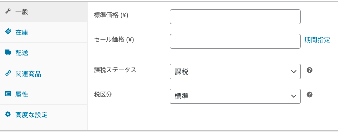 詳細設定では、価格、在庫、サイズと配送料などの設定を行います。
