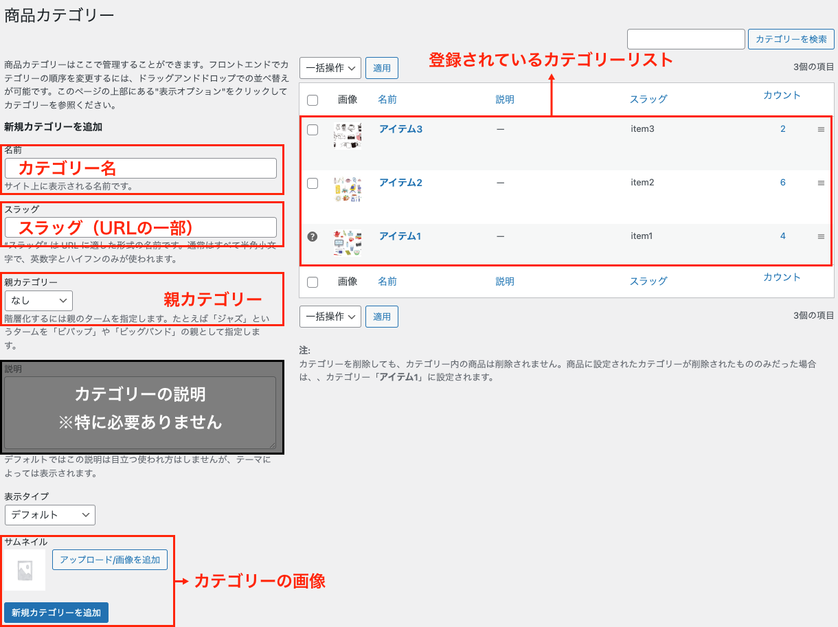 カテゴリーを新規追加する場合は、ページ左側のカテゴリー名、スラッグを入力し、カテゴリーの画像をアップロードします。