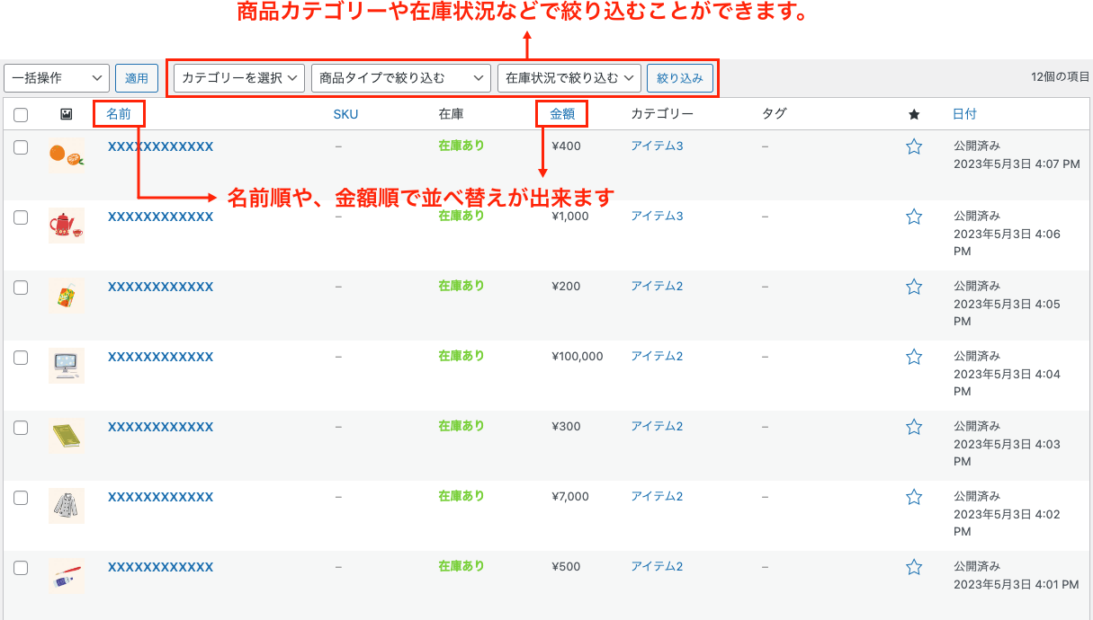 一覧表示は絞り込んだり、並べ替えたりすることが出来ます。