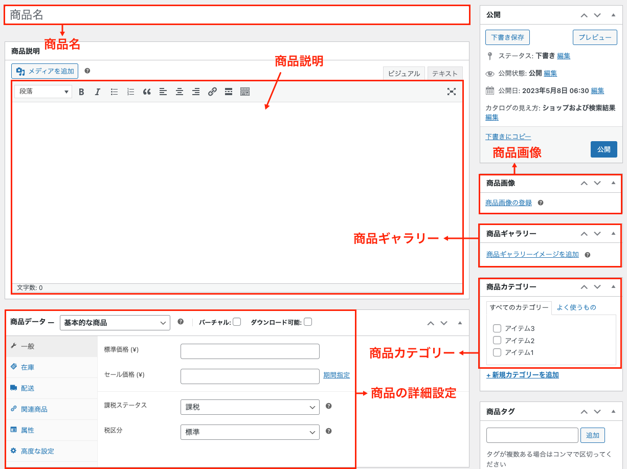 運営管理画面から【商品管理】>【新規追加】をクリックすると新規追加ページが開きます。