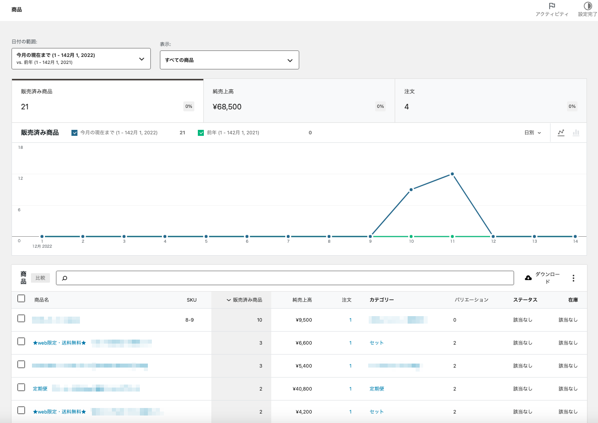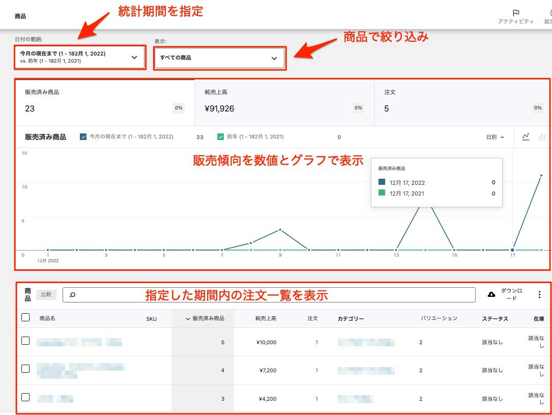 販売商品数、純売上高、注文数の統計および販売一覧を表示することができます。