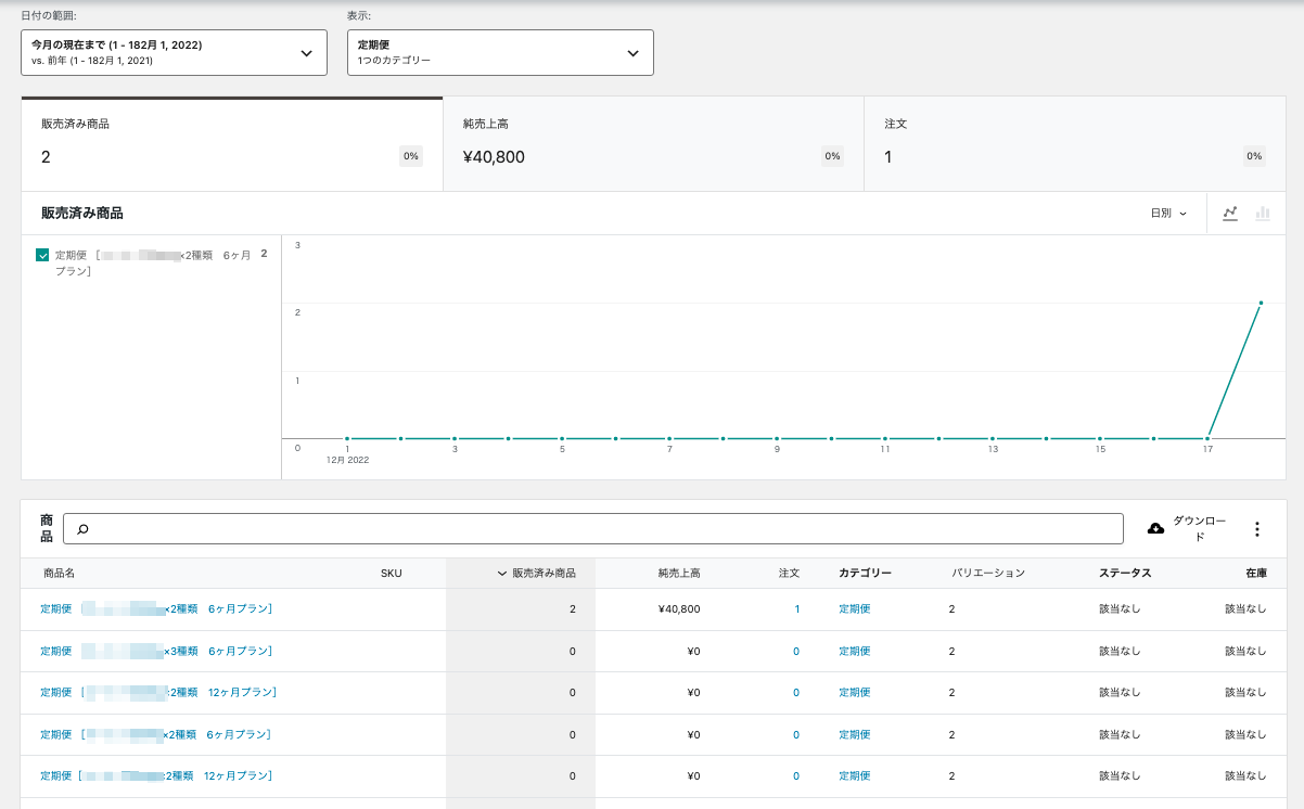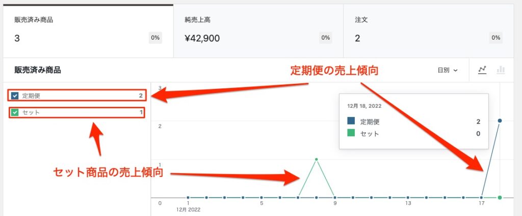 「定期便」や「セット」などのカテゴリーごとの統計および販売一覧を表示することができます。